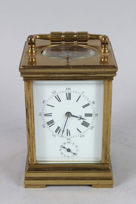 A FRENCH BRASS REPEATER CARRIAGE CLOCK.