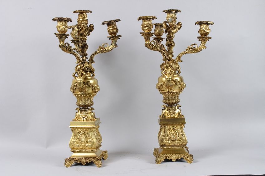 A VERY GOOD PAIR OF LOUIS XVITH CAST GILT BRONZE FOUR LIGHT CANDELABRA with classical figures, lion masks and garlands.