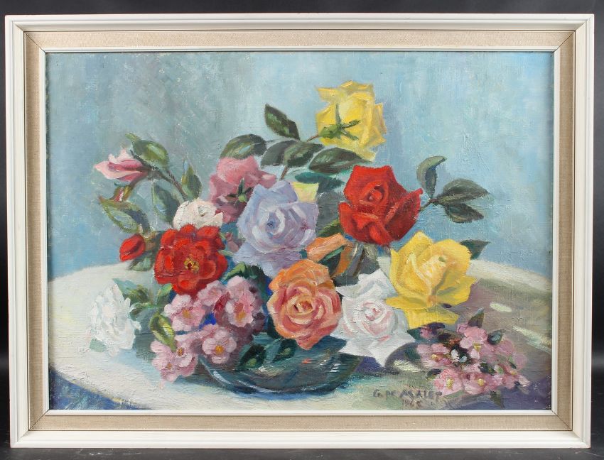 GINETTE DE MALET ROQUEFORTBowl of roses and other flowersoil on canvas,signed and dated 196550.5 x 40.5cm