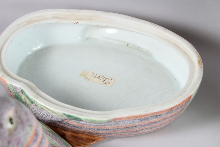 A LARGE PAIR OF CHINESE FAMILLE ROSE GEESE TUREENS AND COVERS