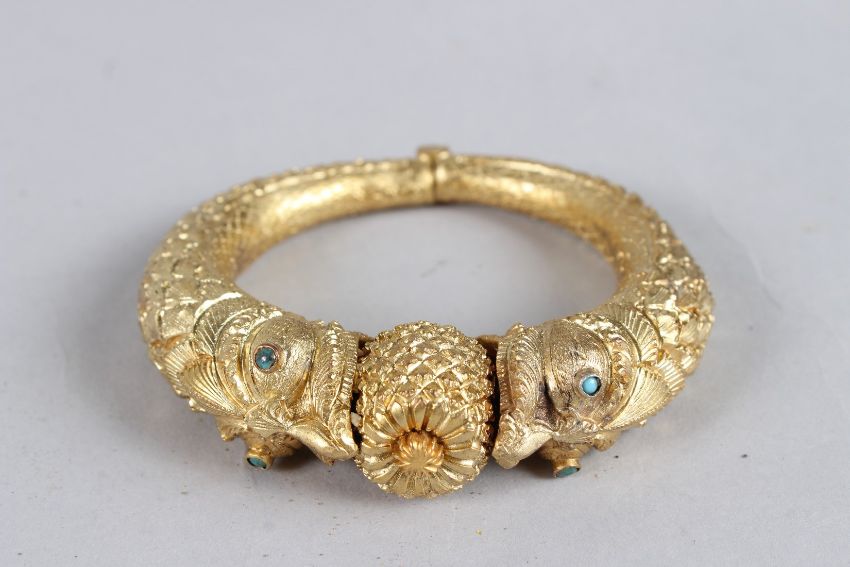 A FINE 19TH CENTURY SOUTH INDIAN GILT METAL BANGLE with dragon heads