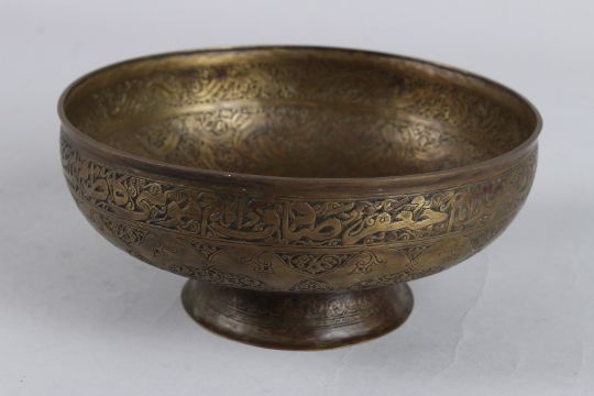A FINELY ENGRAVED 19TH CENTURY INDO PERSIAN BRASS BOWL with calligraphy and fish designs.