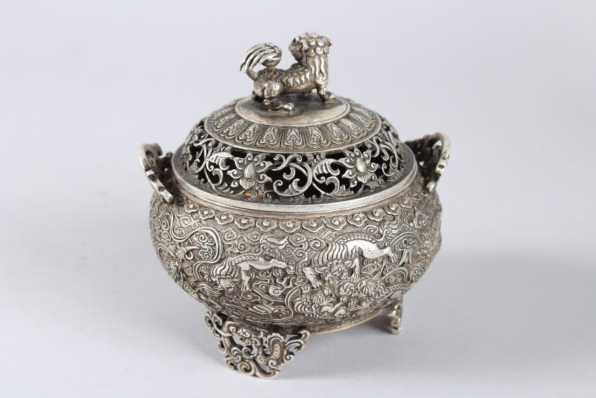 A CHINESE WHITE METAL CENSER AND COVER.