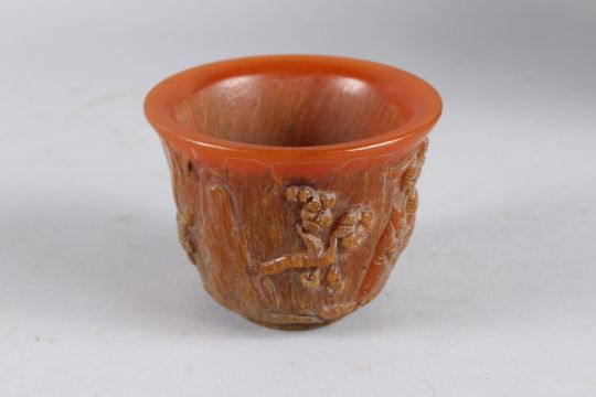 A GOOD CARVED HORN CIRCULAR BOWL the sides carved with figures10cm diameter