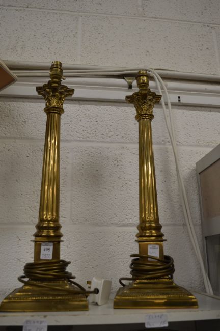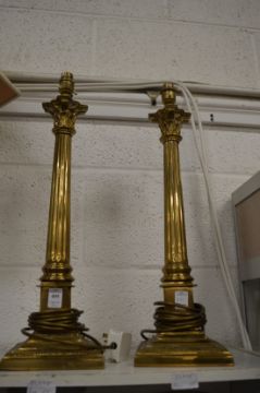 A pair of brass corinthian column table lamps.