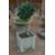 A pair of faux lead square shaped planters, each containing an artificial shrub.