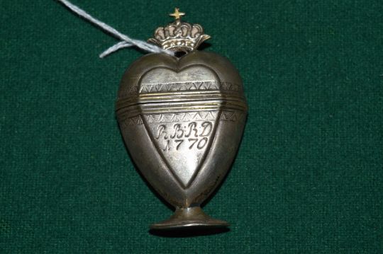 An 18th century white metal heart shaped vinaigrette engraved R B R D 1770.
