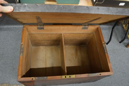 A 19th century metal bound teak campaign chest, sign written to the front with owners details 'Captain H Gore, The Connaught Rangers' (served in the Crimean, 1854-56).