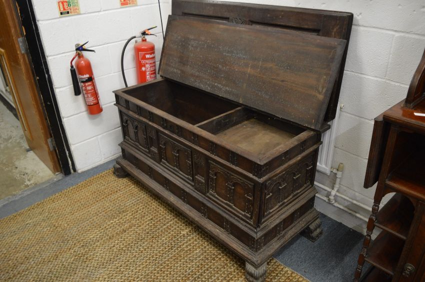 A Continental carved hardwood cassonne with double rising top, a door to the front enclosing small drawers.