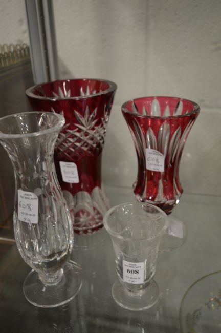 Two William Yeoward cut glass vases and two vases with ruby glass decoration.