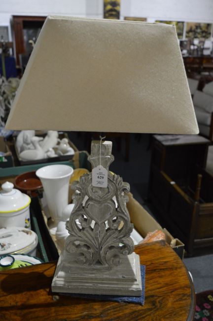 A pair of carved wood and distressed painted table lamps.