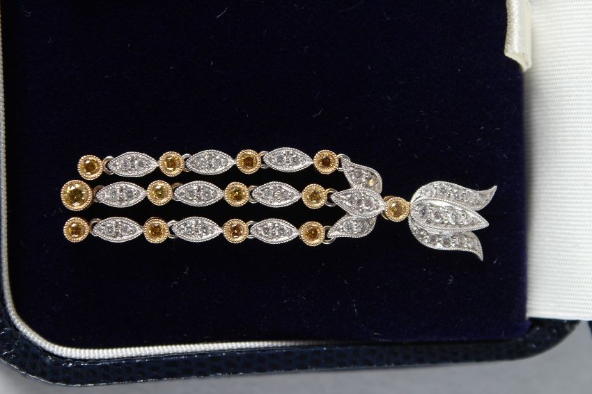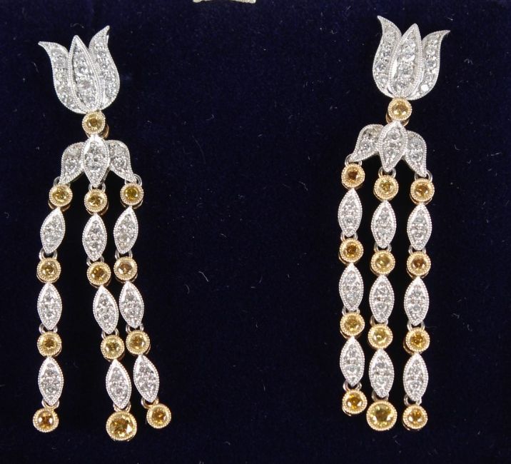 A PAIR OF WHITE AND YELLOW 18CT GOLD DROP EARRINGS.
