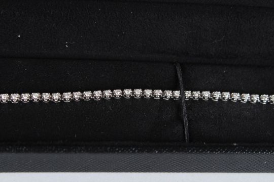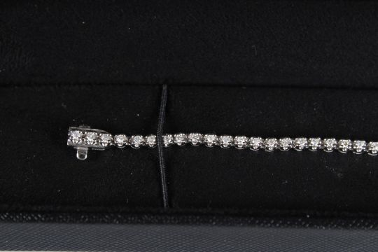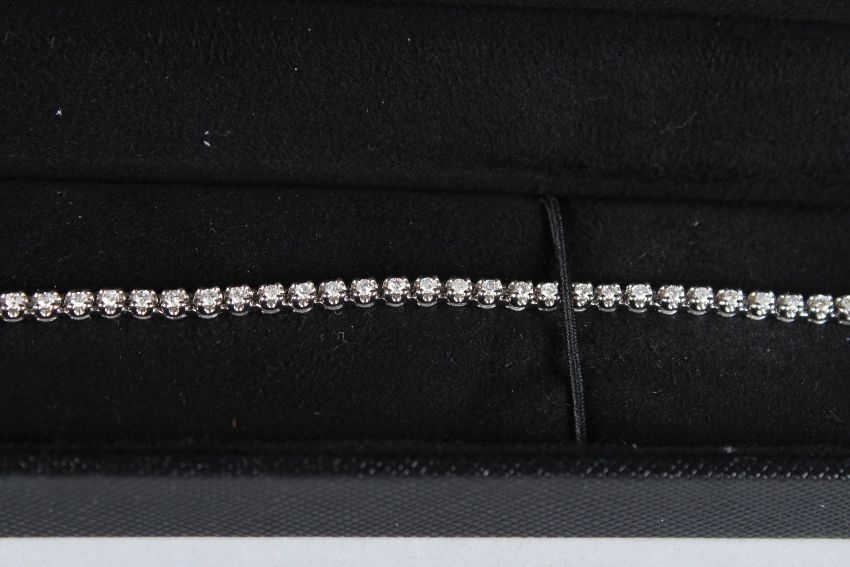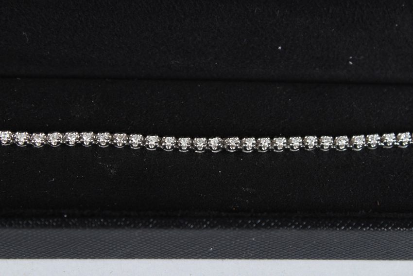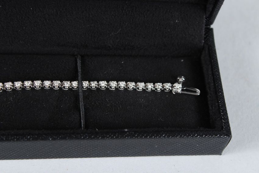 A 9CT WHITE GOLD AND DIAMOND LINE BRACELET.