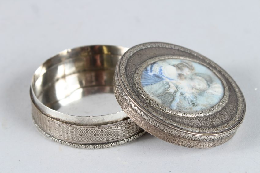 A GOOD 18TH CENTURY FRENCH SILVER CIRCULAR BOX AND COVER, the lid with an ivory panel painted with two ladies.