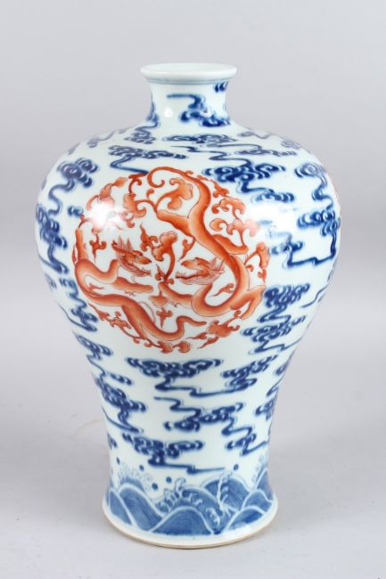 A GOOD CHINESE PORCELAIN BLUE AND WHITE DRAGON MEIPING VASE.