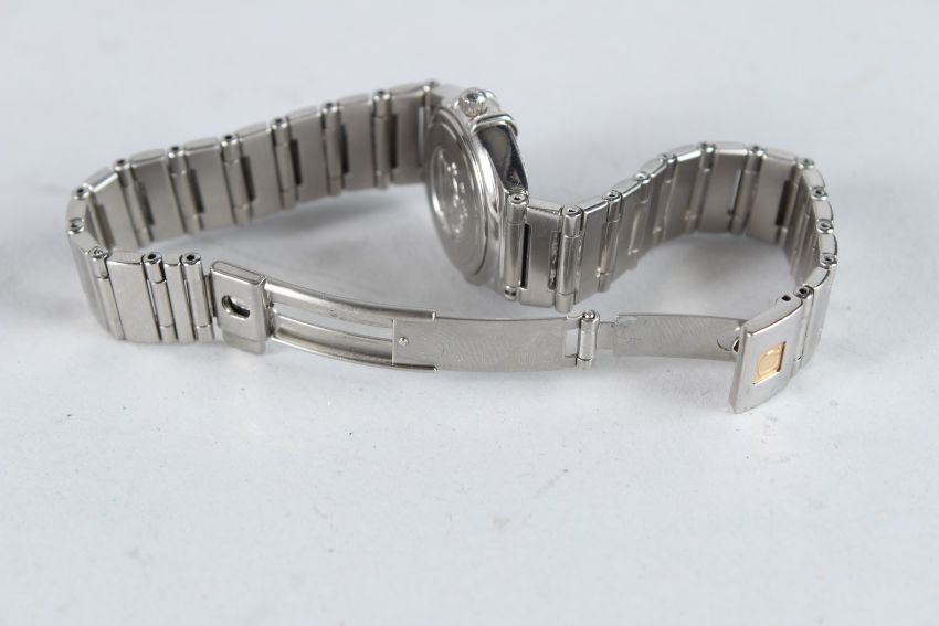 A LADIES OMEGA STAINLESS STEEL CONSTELLATION DIAMOND SET WATCH with blue dial, in an Omega box.