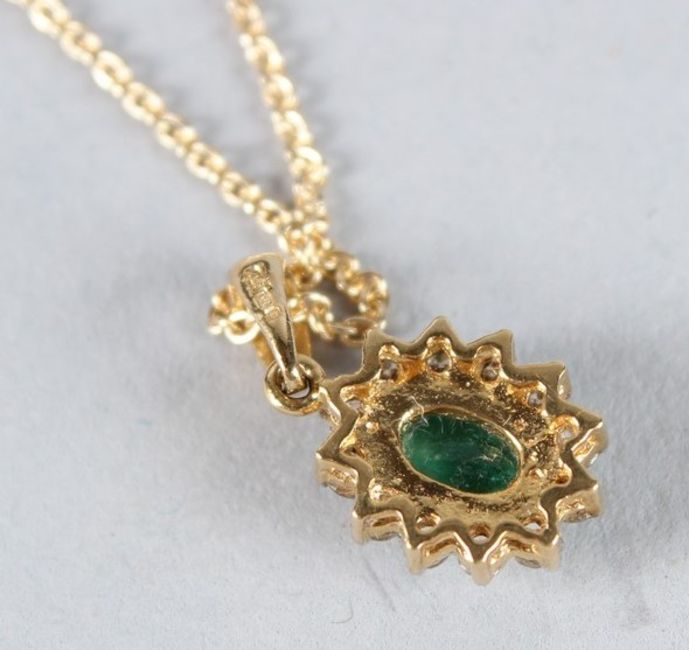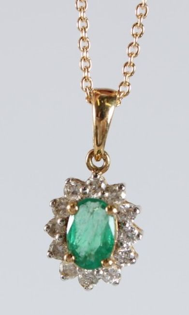 AN 18CT GOLD, OVAL EMERALD AND DIAMOND PENDANT AND CHAIN.