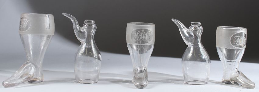 FIVE VARIOUS HUNTING BOOT GLASSES.