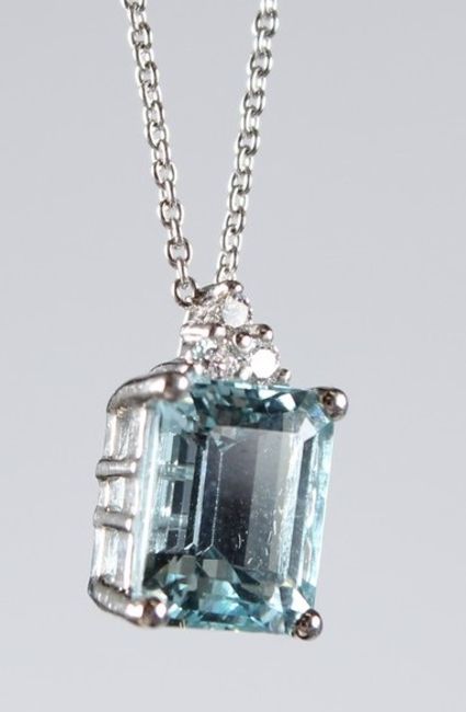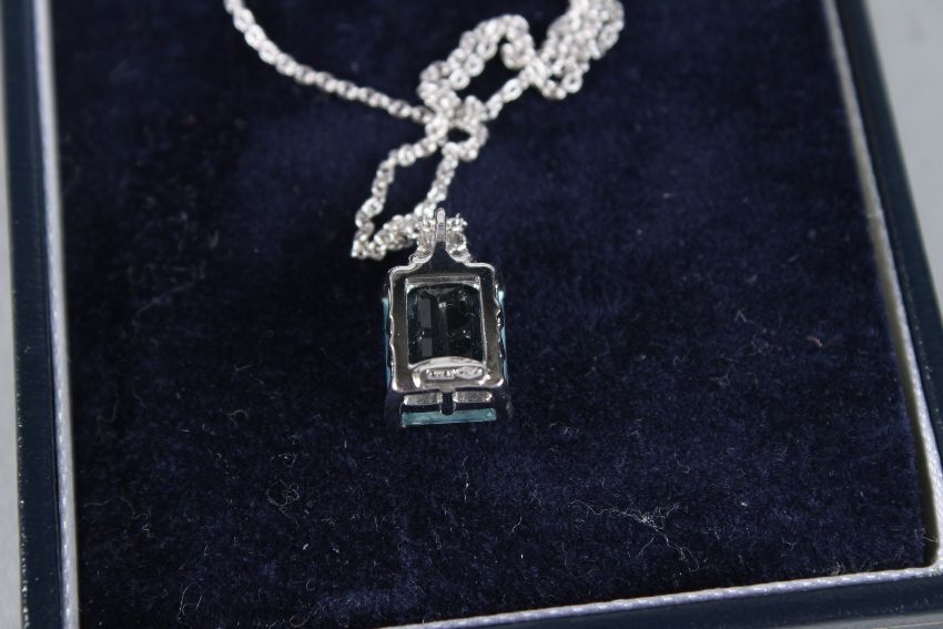 A 3.5 AQUAMARINE AND DIAMOND PENDANT AND CHAIN.