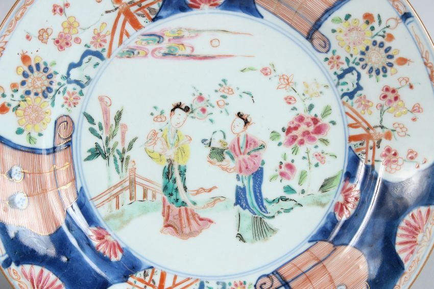 8.5ins diameter. Famille Rose with two figures. Circa 1740.
