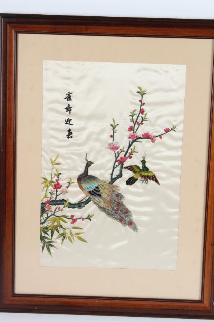 A GOOD PAIR OF CHINESE SILKWORK PICTURES of peacocks and flowers, framed and glazed.