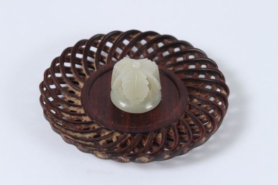 A VERY FINE 19TH CENTURY CHINESE JADE OPENWORK CARVING depicting a small tree with a wooden open work stand.