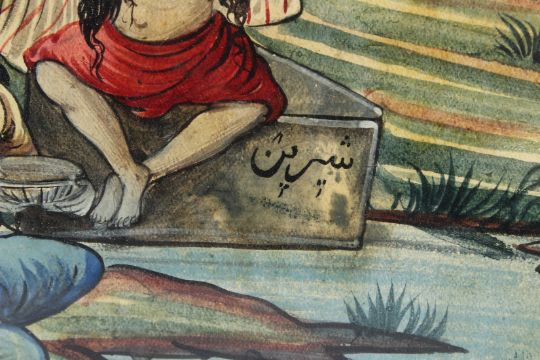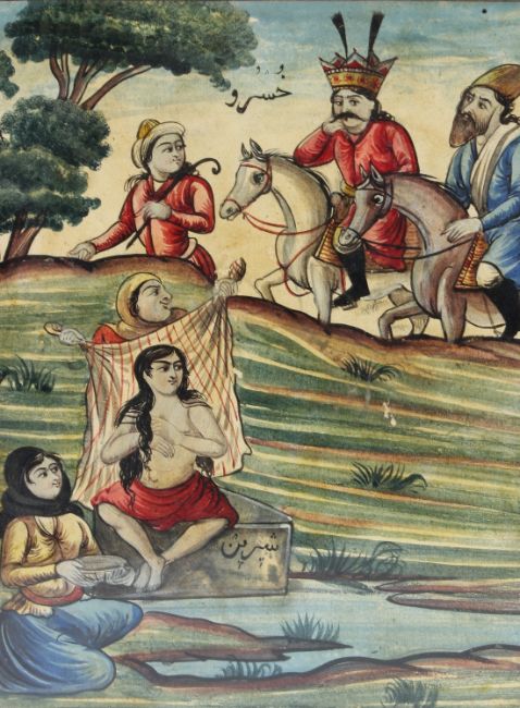 A 19TH CENTURY PERSIAN QAJAR PAINTING depicting Khusro and Shirin.
