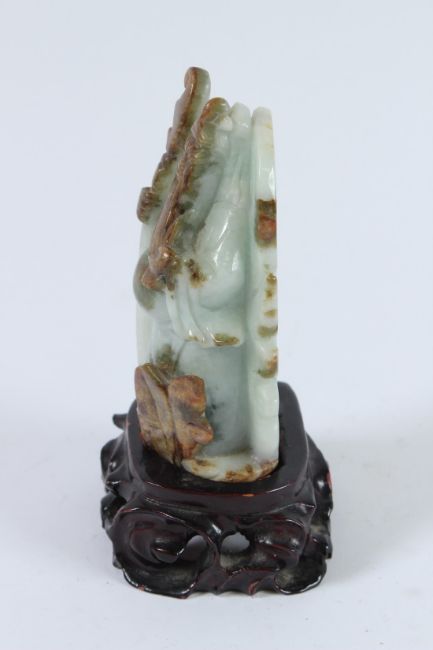 A CHINESE TWO COLOUR JADE CARVING OF GUAN GONG holding a staff.