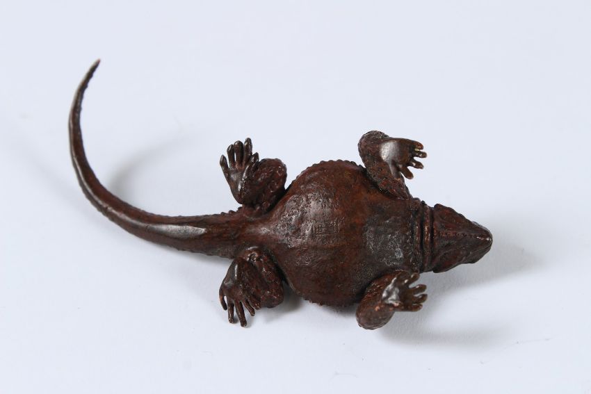 A JAPANESE BRONZE OKIMONO LIZARD.