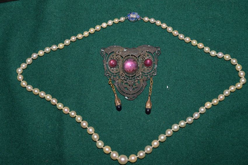 Pearl necklace and a decorative pendant.