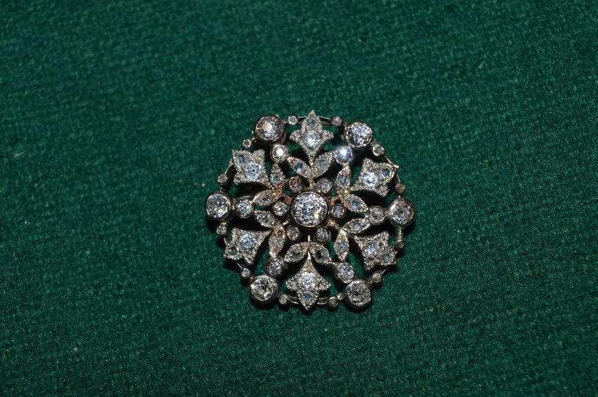 A gold and diamond set circular flower head brooch.