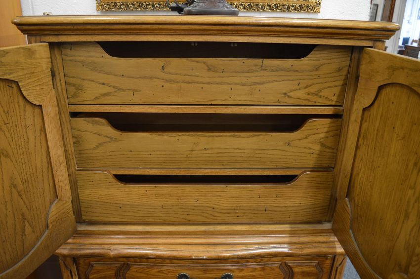 A Continental oak tallboy with pair of doors enclosing slides above three long drawers.