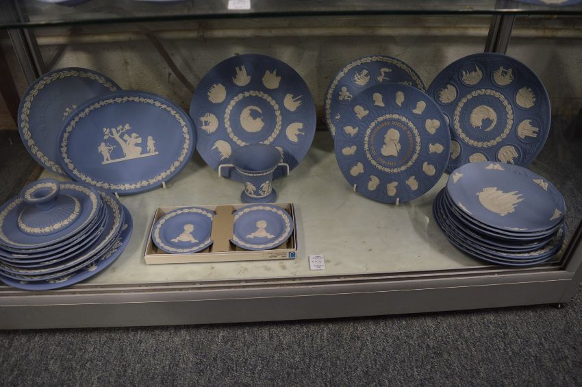 A very large collection of Wedgwood pale blue Jasperware to include numerous boxes, plates, bowls, clocks etc.
