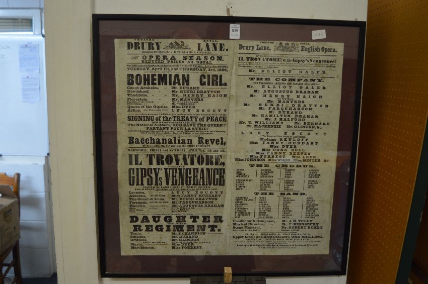 Theatre Royal Drury Lane, framed and glazed billboard dated 1856.