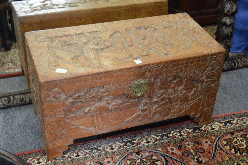 A small Chinese carved camphor wood coffer.