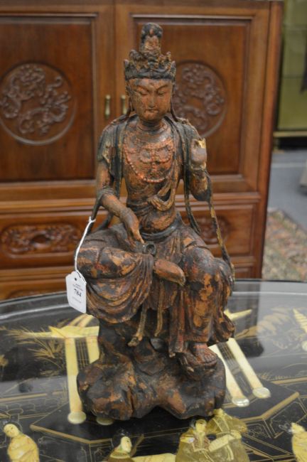 An 18th century carved wood seated Buddha with traces of painted decoration.