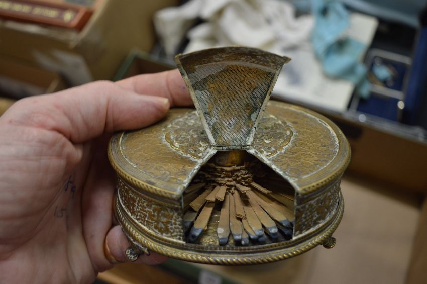 An unusual brass matchbook holder and other items.