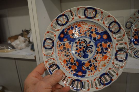 A Chinese porcelain plate painted with flowers together with a set of four Imari decorated plates with pierced borders.