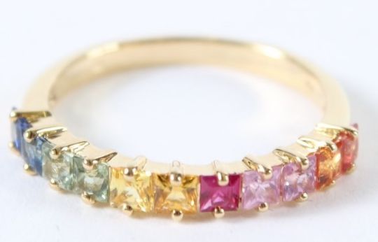 AN 18CT GOLD MULTI-SAPPHIRE HALF HOOP RING.