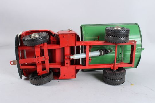 A GOOD TINPLATE RED AND GREEN TIPPER TRUCK.