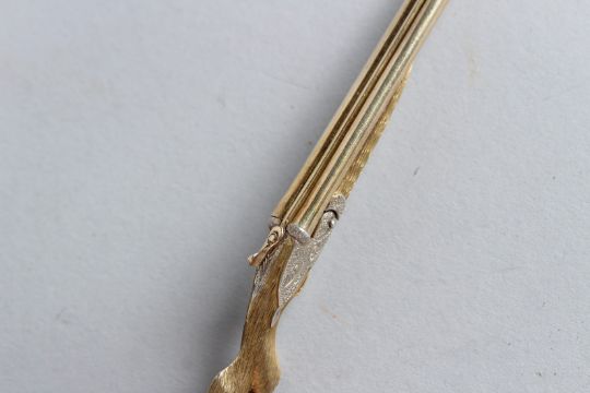 A SILVER GILT MINIATURE DOUBLE BARREL SHOTGUN, 15cms long, Birmingham 1964, and a branch, both in a glass domed case by Arthur Price of London.
