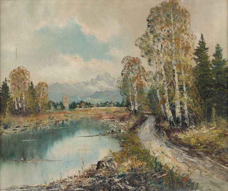 CONTINENTAL SCHOOL (20TH CENTURY) Lake side track with mountains beyond oil on canvas signed indistinctly 49.5 x 59.5cm