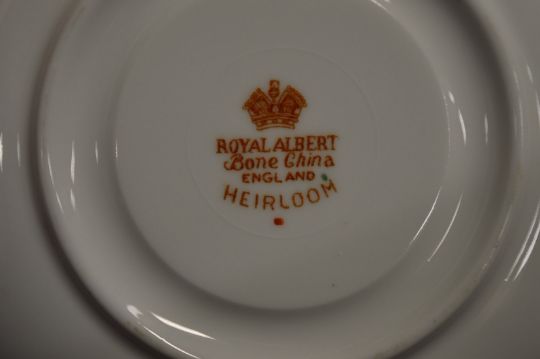 A cased set of six Royal Albert Heirloom pattern coffee cups and saucers (lacking spoons).