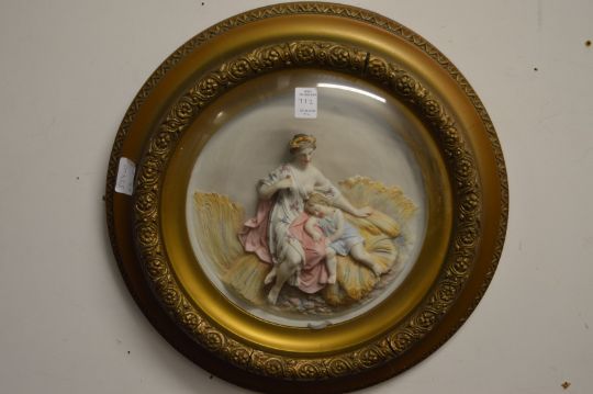A set of four Continental painted bisque porcelain circular plaques depicting the four seasons in bow fronted glazed display cases.