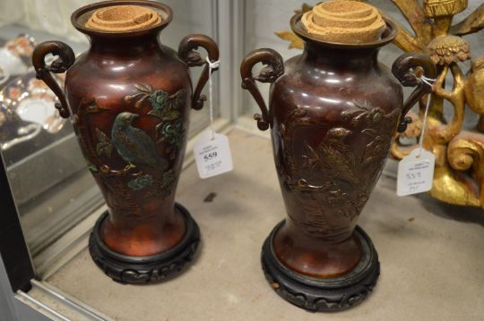 A pair of Japanese decorative bronze twin handled vases with hardwood stands.