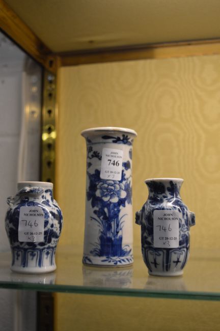 Small Chinese blue and white sleeve vase and two small Chinese blue and white vases.