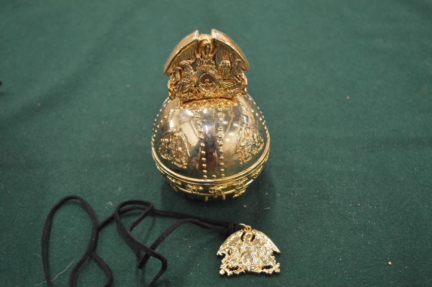 An unusual gilt metal orb, boxed.