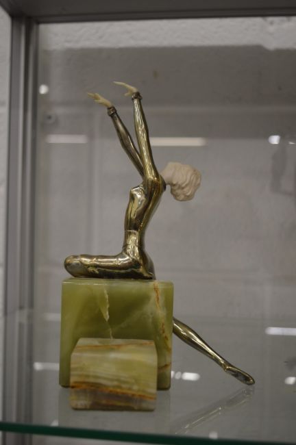 An Art Deco gilt metal figure of a dancer on an onyx base (hands damaged, figure reattached to base).