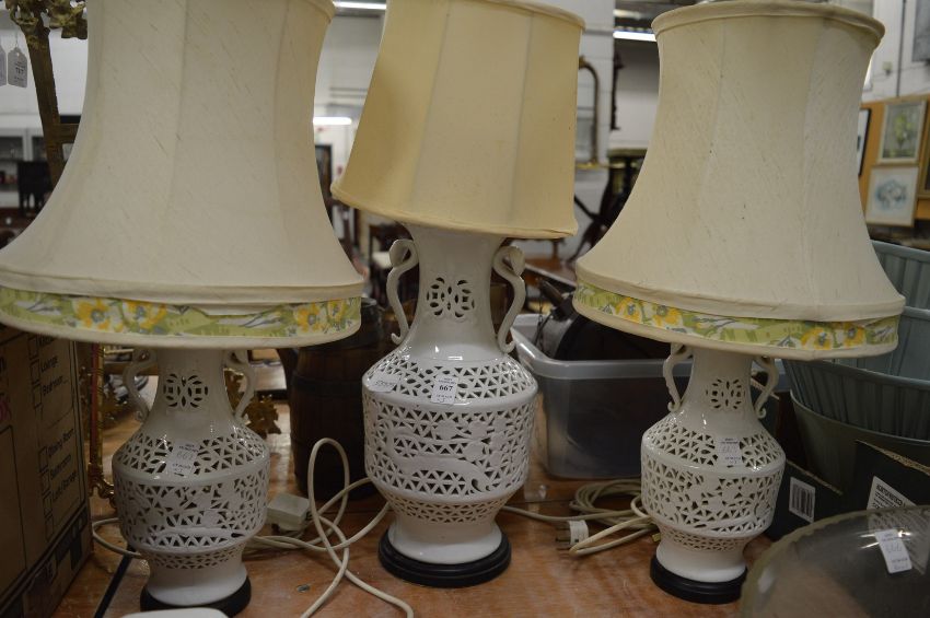 A set of three white porcelain reticulated table lamps.