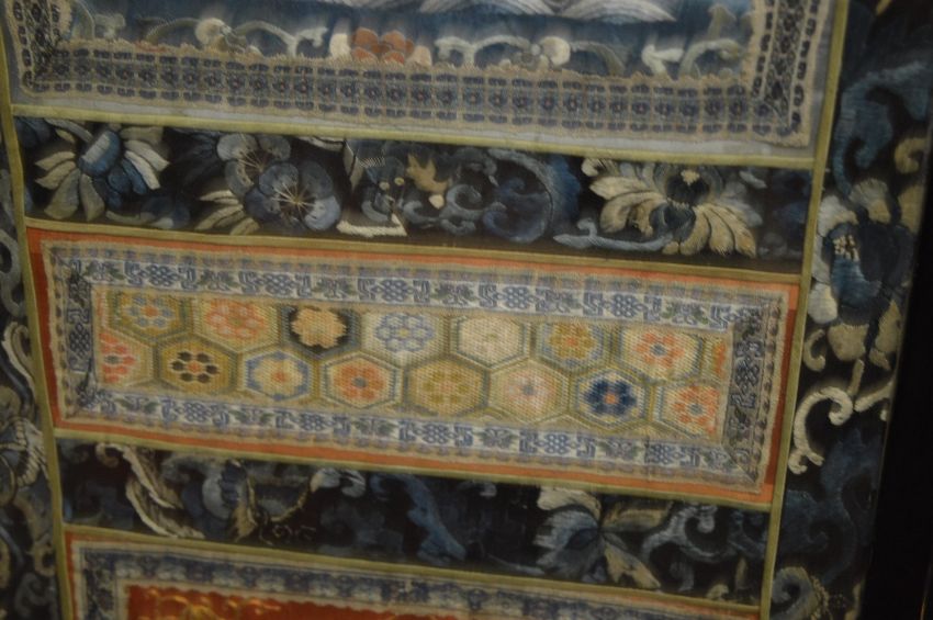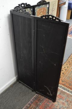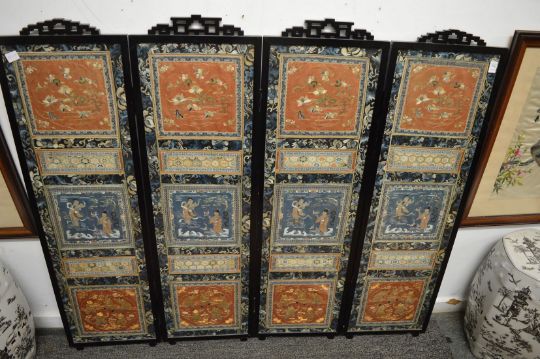 A good Chinese four panel screen, each panel with set of silk embroidered pictures.